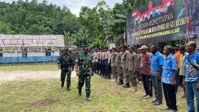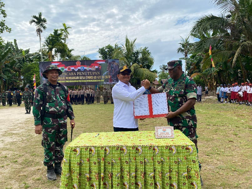 Raja Ampat – Matafaktanews.com. Kepala Staf Komando Daerah Militer (Kasdam) XVIII/Kasuari Brigjen TNI Yusuf Ragainaga resmi menutup kegiatan TNI Manunggal Membangun Desa (TMMD) Ke-122 TA 2024 Kodim 1805/Raja Ampat di Kampung Saporkren, Distrik Waigeo Selatan, Kab. Raja Ampat, Kamis (31/10/2024). Prosesi acara penutupan diawali dengan penyambutan tarian adat mansorandak menginjak piring, dilanjutkan pengalungan kalung dan memakai mahkota di kepala.