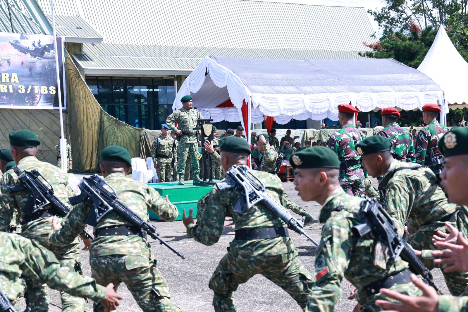 Bertindak selaku Inspektur Upacara (Irup) Panglima Divisi Infanteri (Pangdivif) 3 Kostrad, Mayjen TNI Bangun Nawoko. Dalam sambutanya Pangdivif 3 Kostrad menyampaikan ucapan terimakasih kepada Komandan Lanud Sultan Hasanuddin, Marsma TNI Bonang Bayuaji beserta jajarannya yang setiap hari memantau dari dekat jalanya latihan agar setiap tahapan letihan penerjunan yang menggunakan pesawat Hercules C-130 A-1333 dari Skadron Udara 33 berjalan dengan sempurna.