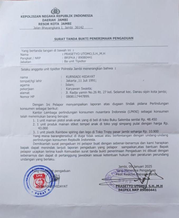 Lanjutnya Kami Dari LPKNI juga Mendampingi AR Untuk membuat Laporan Ke Polresta Jambi, Kenapa Kami Membuat Laporan,Karena Konsumen Merasa Dirugikan.Terkait Dugaan SNI Palsu Yang dipakai.Produk Yang di beli tidak sesuai dengan Apa yang didalam Kemasan, Maupun Buku Petunjuk Panduan berbahasa Indonesia Pun Tidak ada Didalam Produk.Dan Tidak sesuai dengan Undang-undang Perlindungan Konsumen.