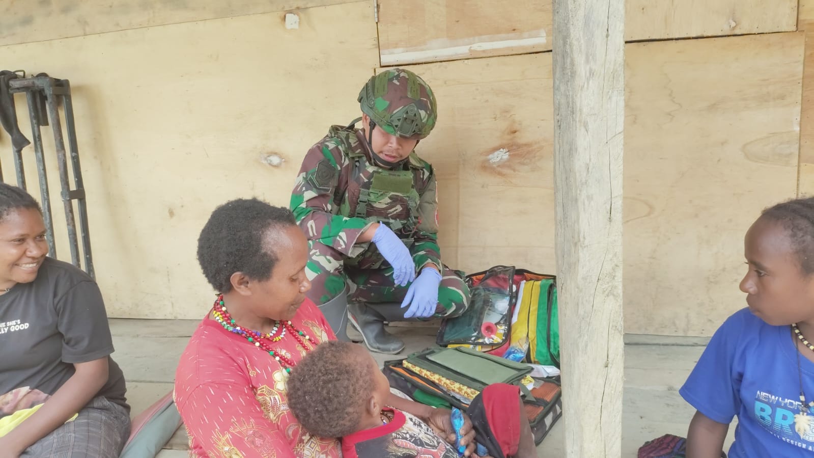 Bermula saat Mama Emite Telenggen (44) datang ke Pos Yambi meminta tolong karena anaknya mengalami sakit dibagian kaki kiri, dengan sigap Bakes Pos Ramil Yambi Serda Rian langsung melaksanakan pengobatan luka infeksi yaitu dengan membersihkan luka dengan cairan infus kemudian memberikan anti biotik serta vitamin agar dapat membaik dan penyembuhannya cepat, “Mama kalau butuh apa-apa datang ke Pos e kita semua disini papa pu sodara,” ucapnya.